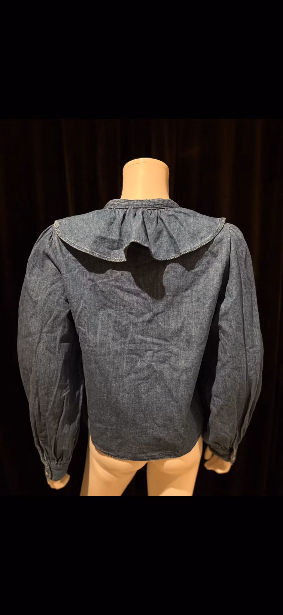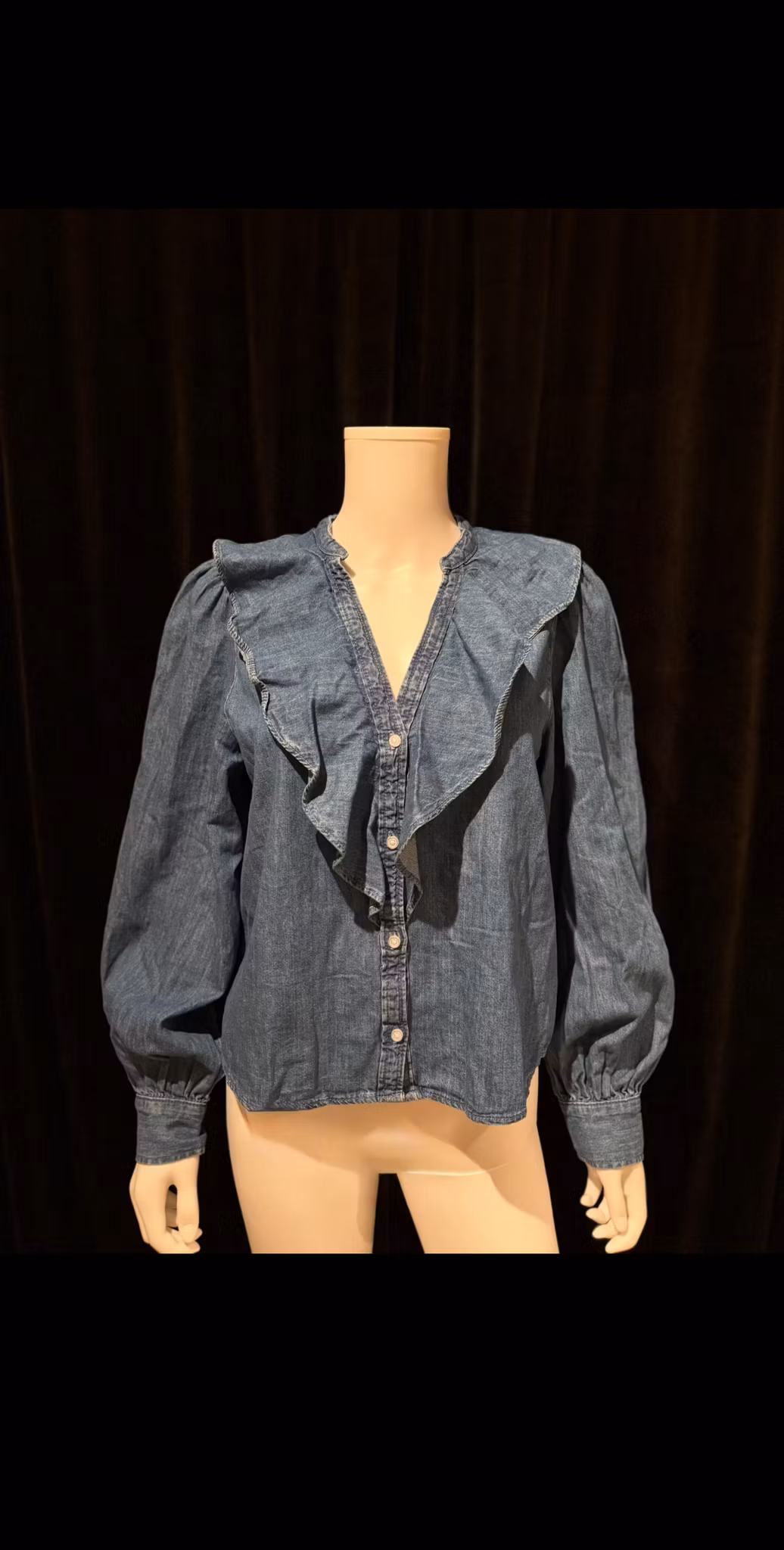 Stilren og feminin denimbluse laget i myk denim. Den har volangdetaljer foran, knappestolpe og lange ermer med mansjetter. En allsidig topp som passer både til hverdags og mer pyntede anledninger.