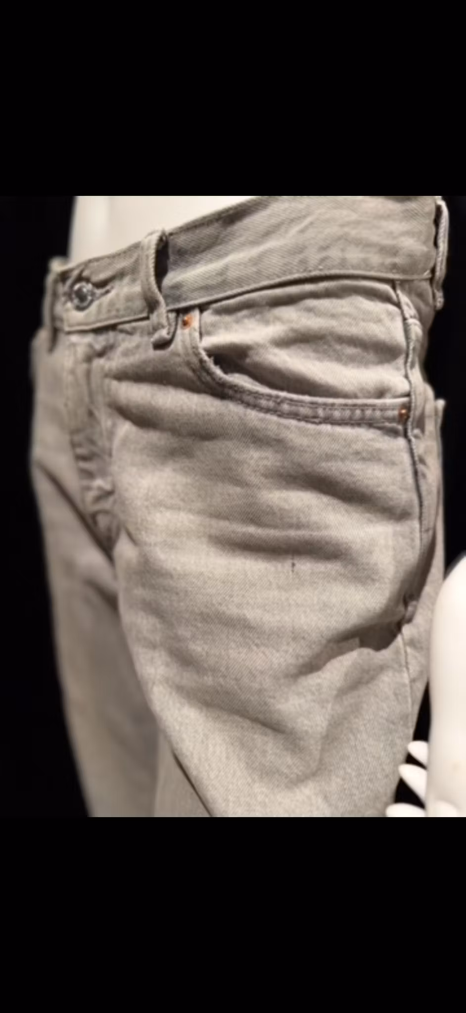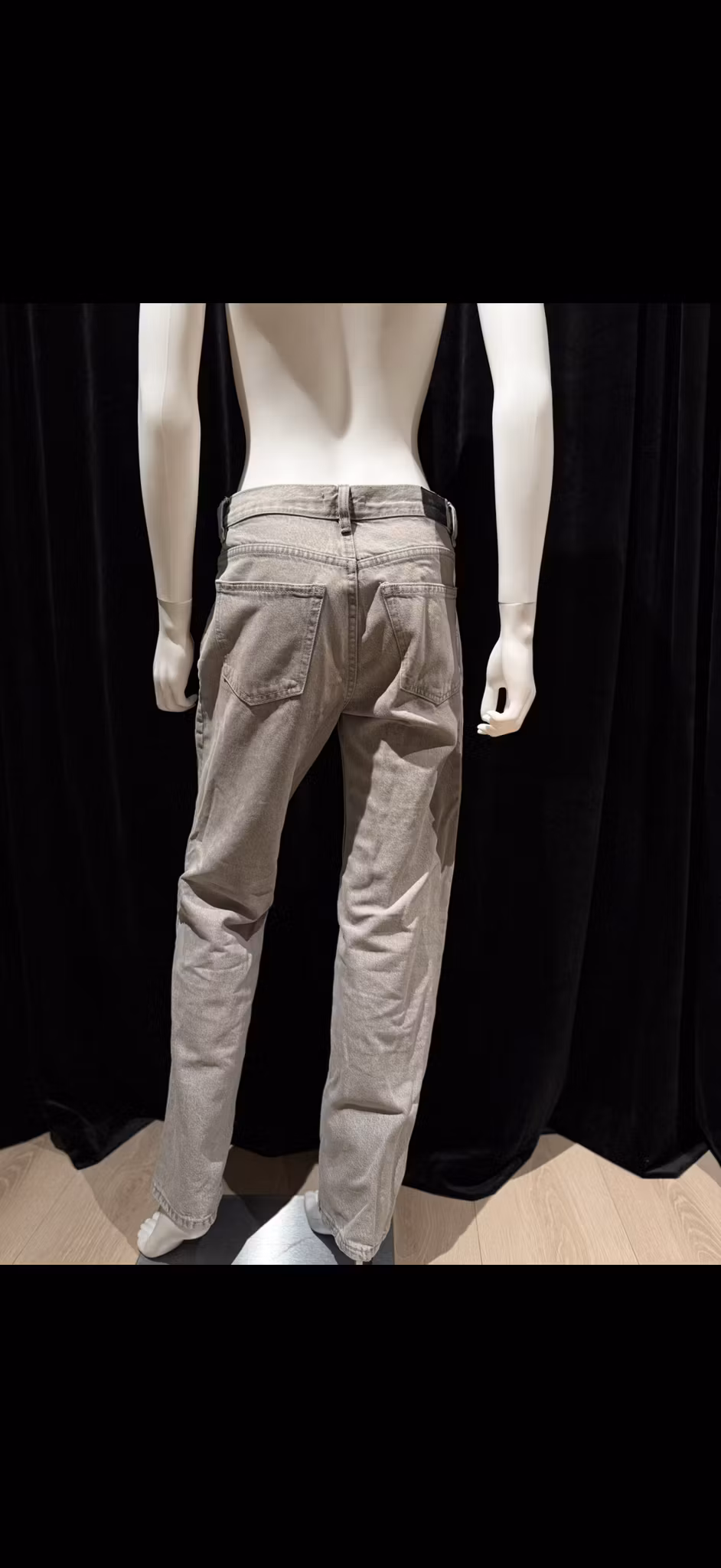 Jeans med lav midje. Jeansene er grå og har rett passform i non-stretch denim. De har lynlås og lommer foran og bak.